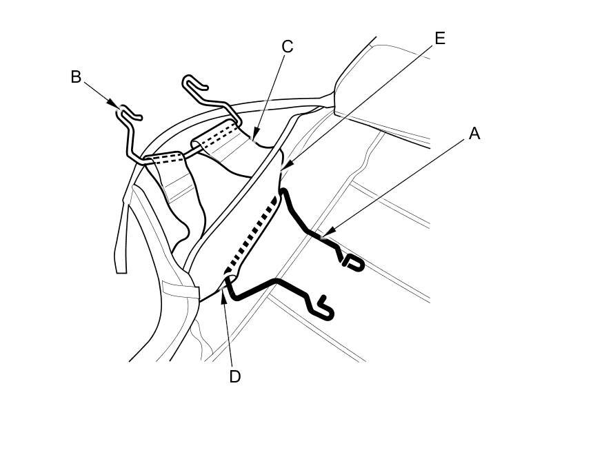 15. Remove airbag attachment wire B from the outside reinforcing cloth (C). Pull airbag attachment wire A out through loop (D) of the inside reinforcing cloth (E). Remove airbag attachment wires A and B.