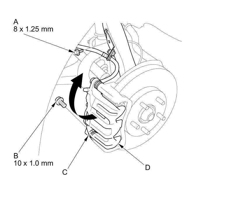 5. Remove the flange bolt (B) while holding the caliper pin (C) with a wrench. Be careful not to damage the pin boot, and pivot the caliper body (D) up out of the way. Check the hose and the pin boots for damage and deterioration.