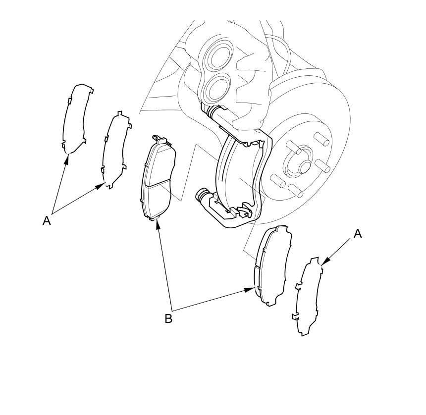 9. Clean the caliper bracket (B) thoroughly; remove any rust, and check for grooves and cracks.