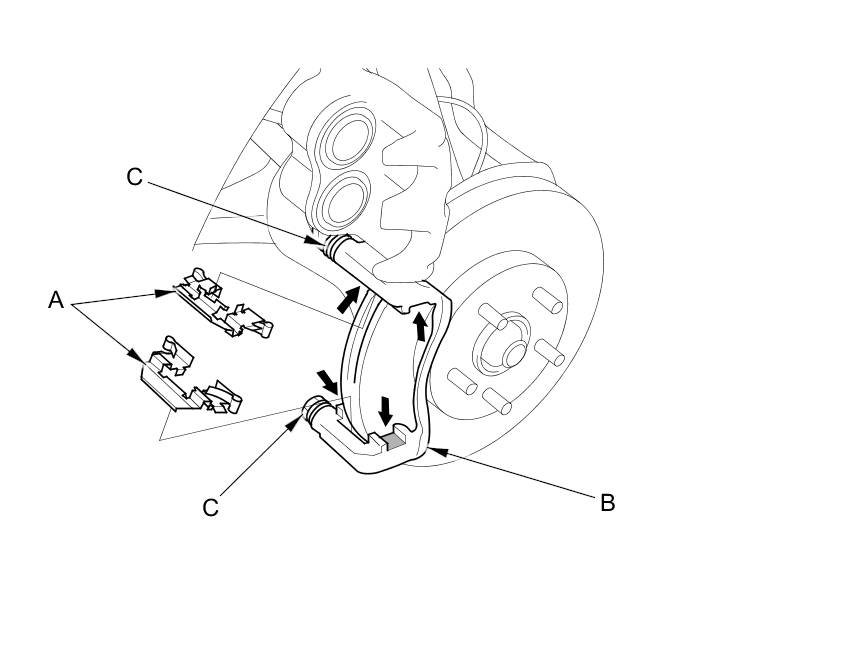 17. Install the brake pads and the pad shims correctly. Install the brake pad with the wear indicator (C) on the upper inside position. If you are reusing the brake pads, always reinstall the brake pads in their original positions to prevent a temporary loss of braking efficiency.