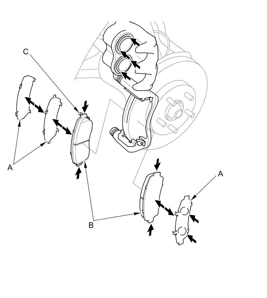 Verify that the caliper pins (C) move in and out smoothly. Clean and lube if needed.
