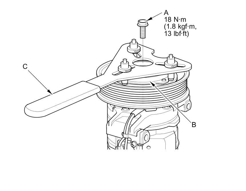 1. Remove the center bolt (A) while holding the pressure plate (B) with the A/C clutch holder (C).