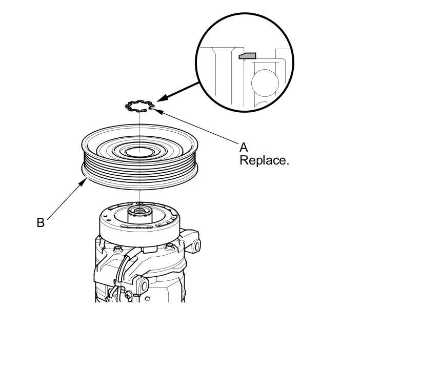 3. If you are replacing the field coil, remove the snap ring (A) with snap ring pliers, then remove the pulley (B). Be careful not to damage the pulley or the A/C compressor.