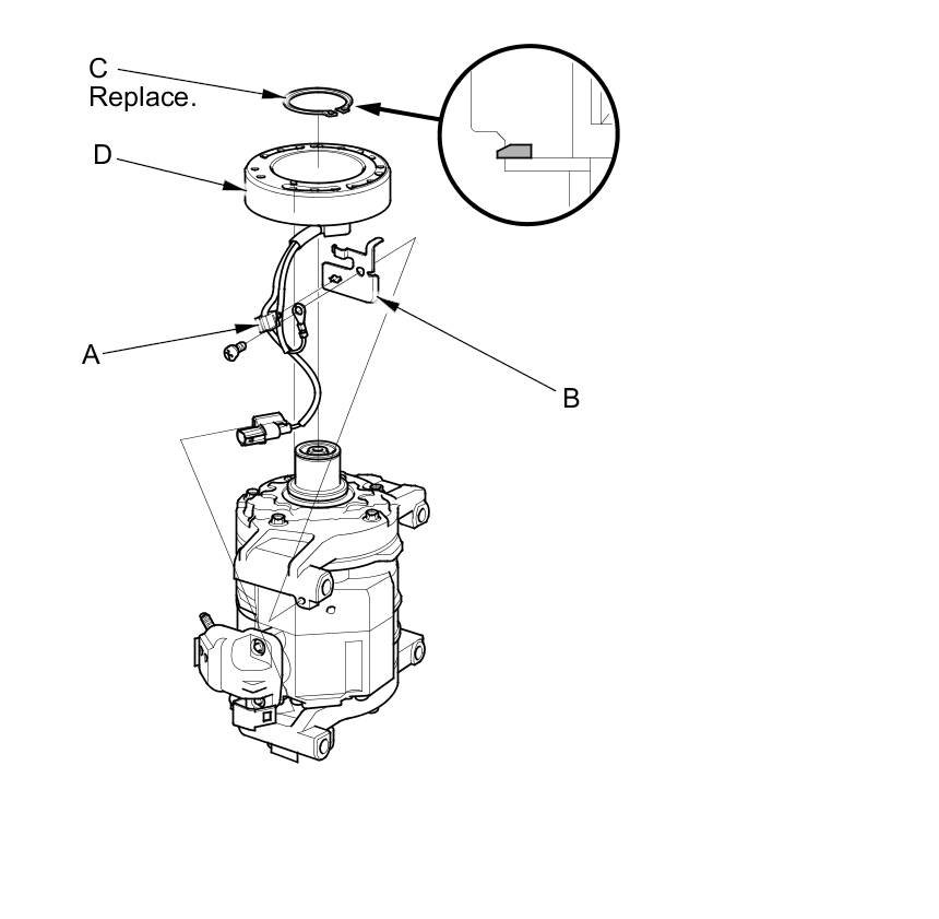 4. Remove the screw, the harness clip (A), and the holder (B). Remove the snap ring (C) with snap ring pliers, then remove the field coil (D). Be careful not to damage the field coil or the A/C compressor.