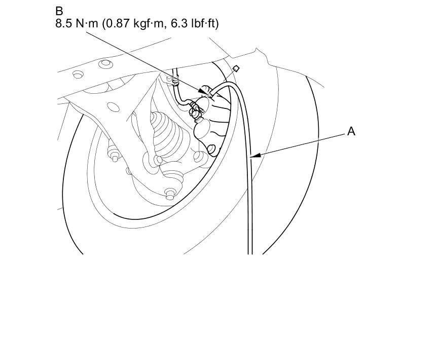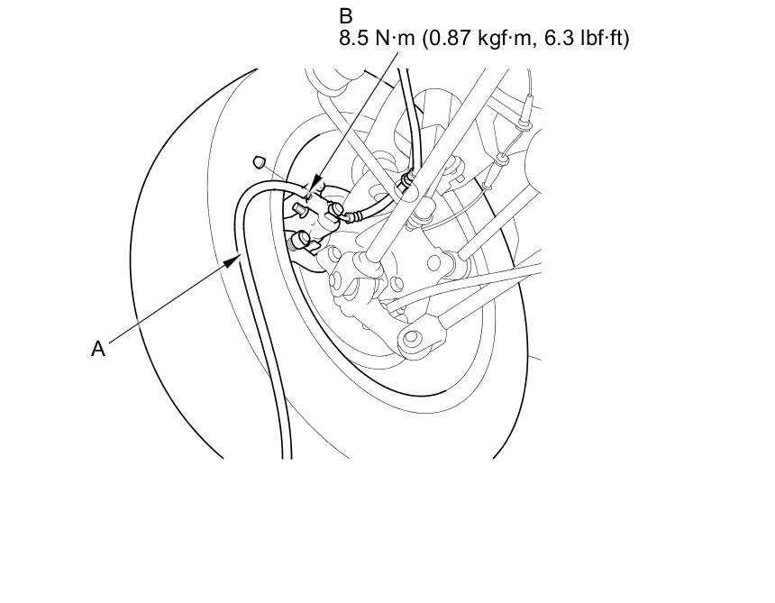 4. Attach a length of clear drain tube (A) to the bleed screw (B), then loosen the bleed screw to allow air to escape from the system. Then tighten the bleed screw securely.