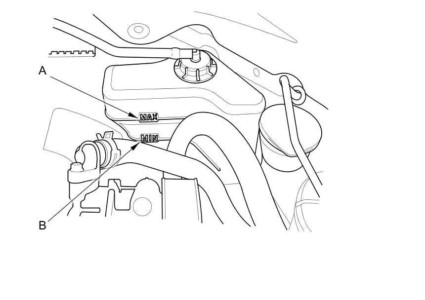 1. Check the coolant level in the coolant reservoir. Make sure it is between the MAX mark (A) and the MIN mark (B).