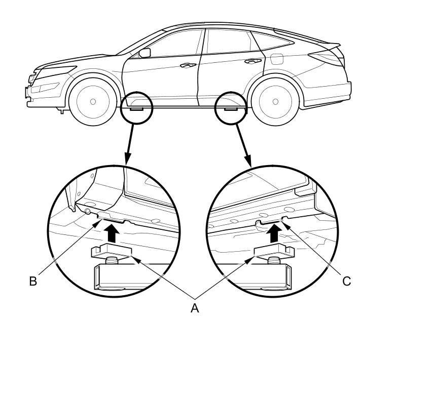 1. Position the lift pads (A) under the vehicle's front support points (B) and rear support points (C).
