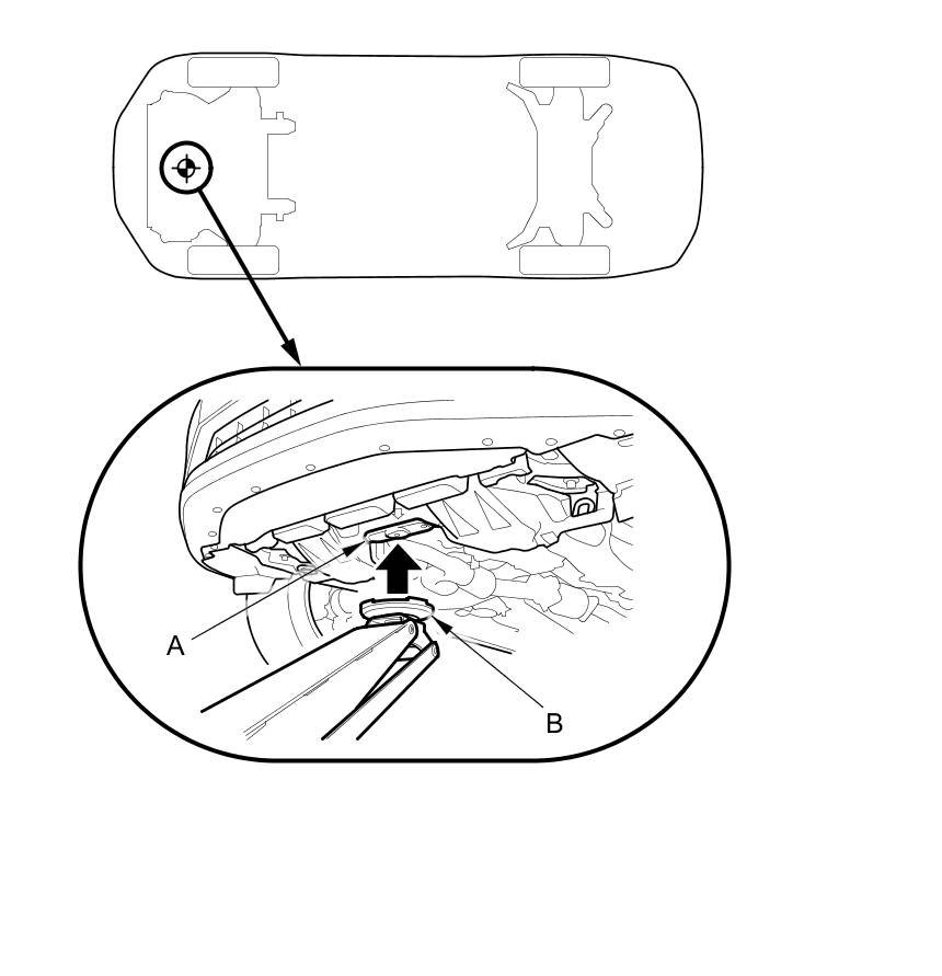 3. Position the floor jack under the front jacking bracket (A). Center the jacking bracket on the jack lift platform (B), and jack up the vehicle high enough to fit the safety stands under it.