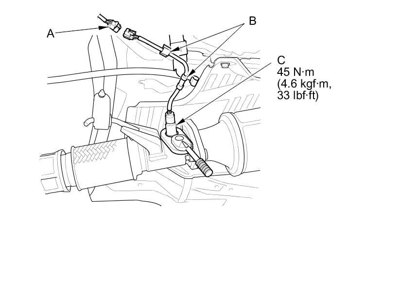 1. Disconnect secondary HO2S 4P connector (A) and these clips (B), then remove the secondary HO2S (C).