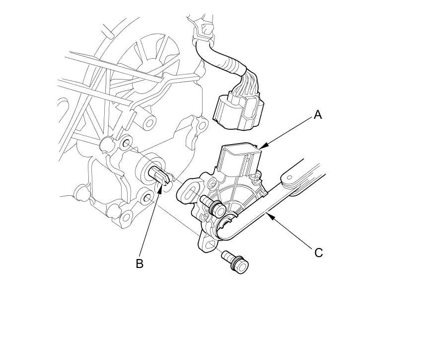 9. Install the transmission range switch (A) gently on the selector control shaft (B) while holding it in the N position with the 2.0 mm (0.079 in) blade (C).