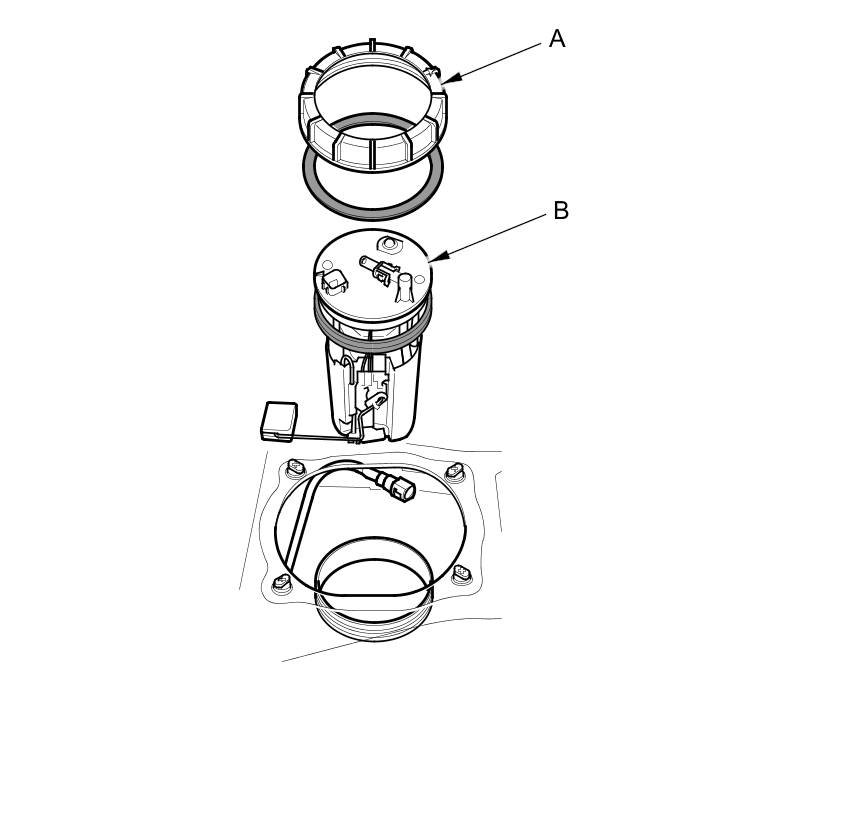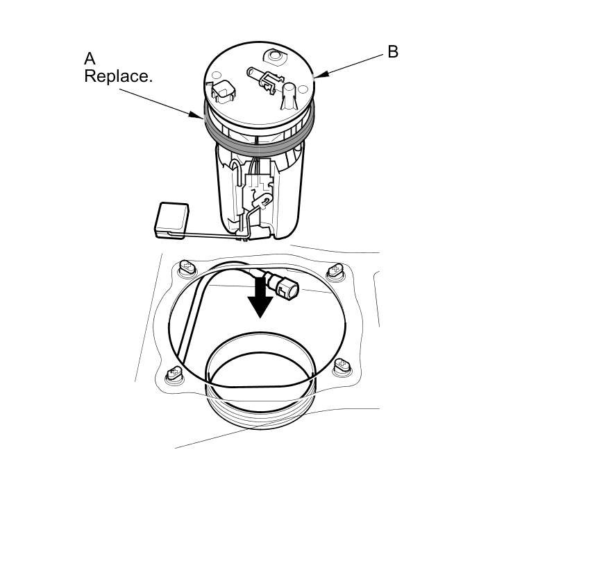 1. Temporarily attach a new base gasket (A) to the fuel tank unit (B), then insert the fuel tank unit partially into the fuel tank.