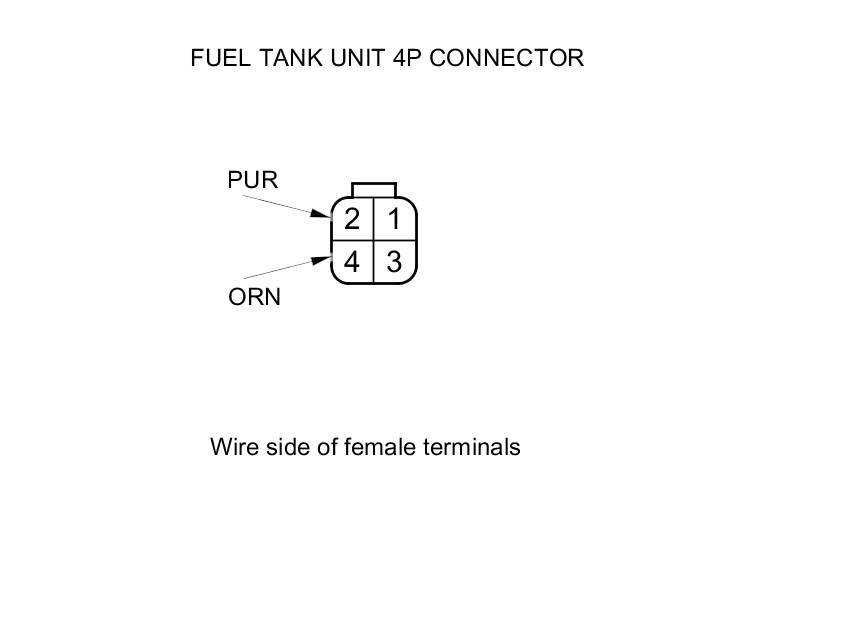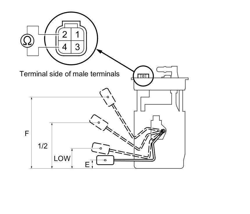 10. Measure the resistance between fuel tank unit 4P connector terminals No. 2 and No. 4 with the float at E (EMPTY), LOW (LOW FUEL INDICATOR), 1/2 (HALF FULL), and F (FULL) positions.
