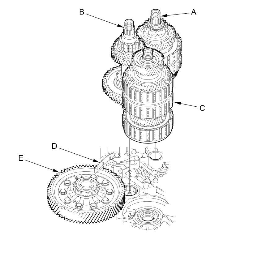 5. Make sure the countershaft subassembly and the differential assembly (E) are clear of the baffle plate.