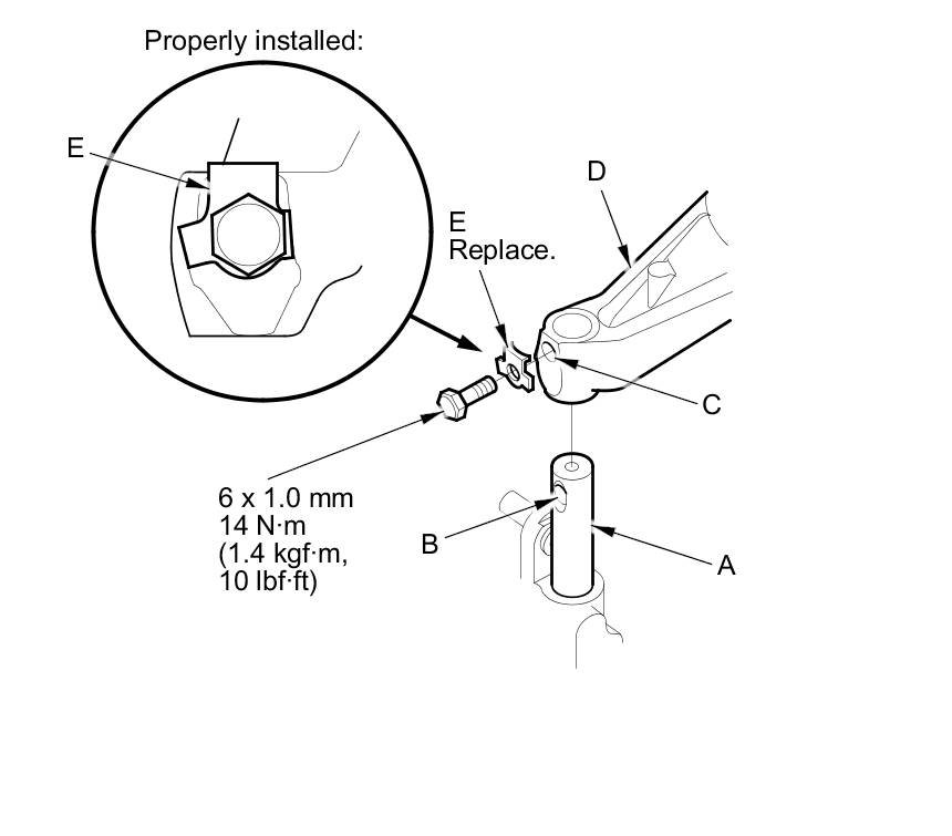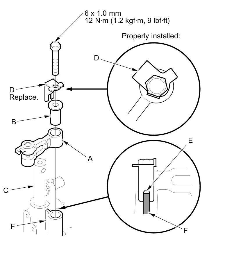 6. If the detent arm was removed, install the detent arm (A) with the arm collar (B) on the servo body (C), and install a new lock washer (D) by aligning its cutout (E) with the projection (F) of the servo body. Install and tighten the bolt, then bend the lock tab of the lock washer against the bolt head.