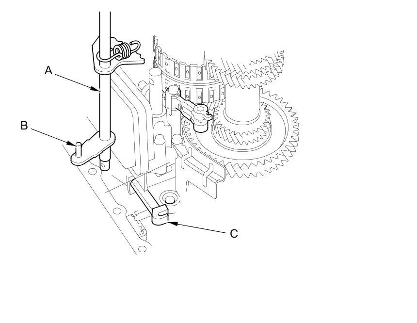 7. Install the selector control shaft (A) in the torque converter housing aligning the manual valve lever pin (B) on the selector control shaft with the guide of the manual valve (C). Pull the manual valve gently when aligning the manual valve with the selector control shaft.