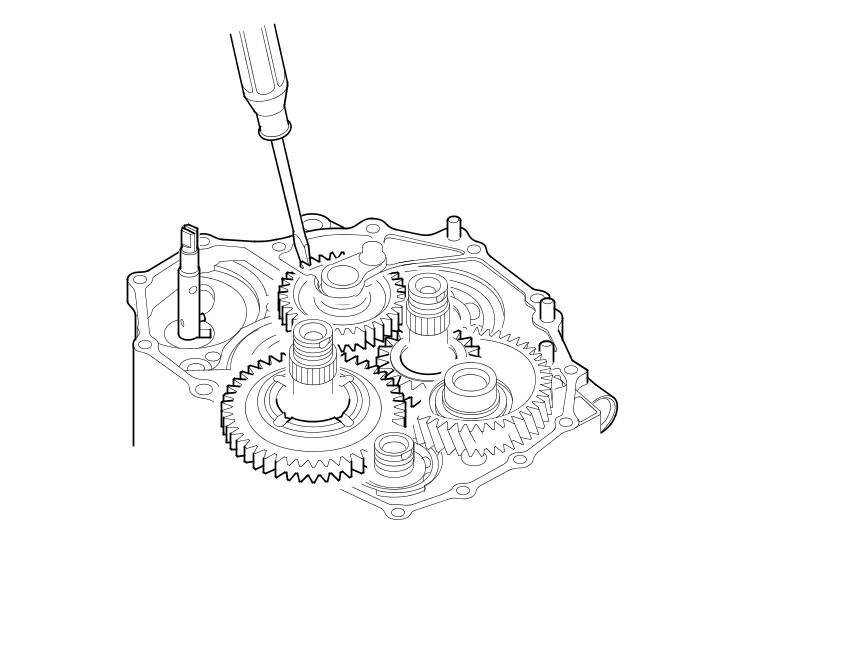 17. Wrap a screwdriver tip with tape to prevent damage to the reverse idler gear teeth. Engage the reverse idler gear with reverse gears by rotating the reverse idler gear using the screwdriver.