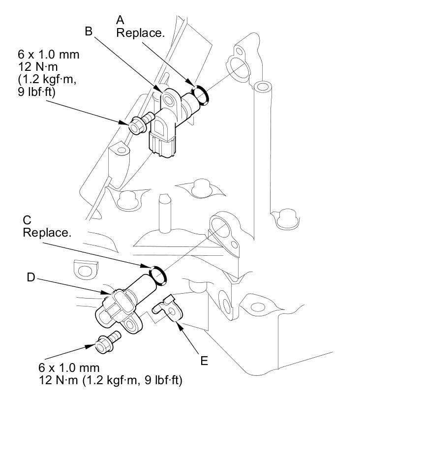 20. Install a new O-ring (C) on the output shaft (countershaft) speed sensor (D), and install the output shaft (countershaft) speed sensor with the sensor washer (E).
