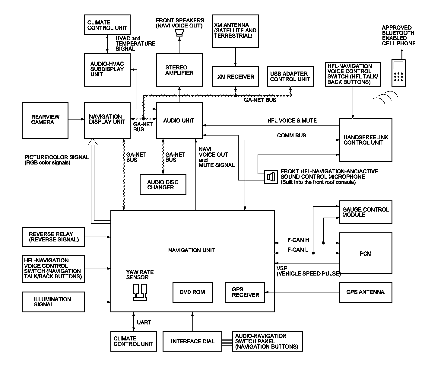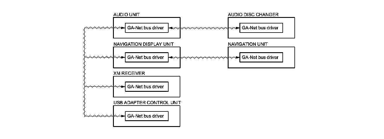 The GA-Net II communication bus passes information back and forth between the navigation display unit, the navigation unit and the audio system. The information passed on this bus is audio settings directed by the navigation unit.