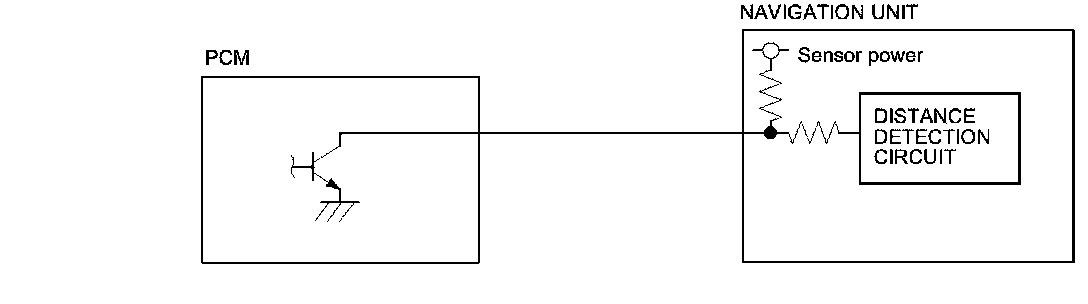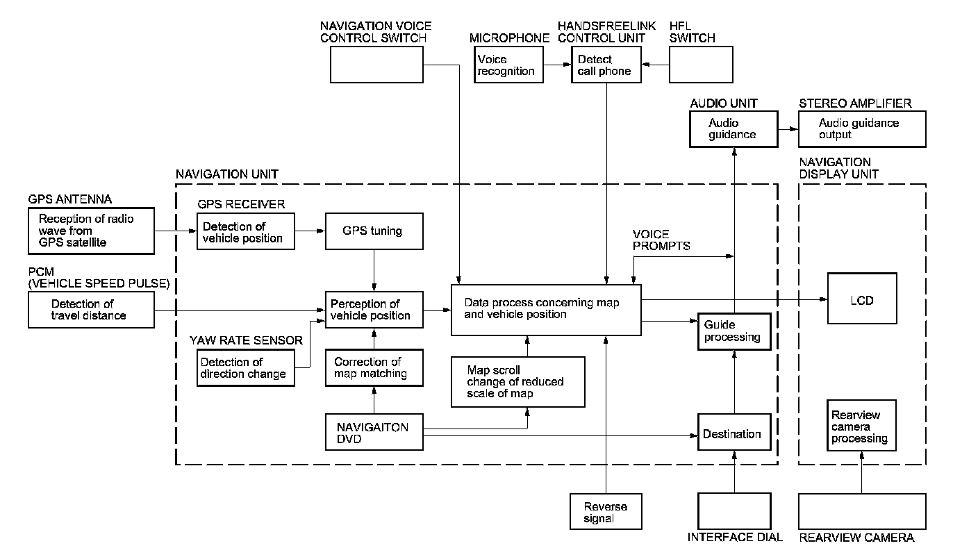 The navigation unit calculates the vehicle position (the driving direction and the current position) by receiving the directional change signals from the yaw rate sensor and the travel distance signals from vehicle speed pulse (VSP) signal of the PCM.