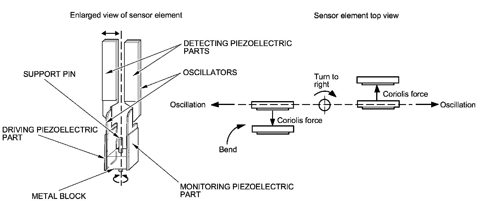 - When the vehicle turns to the right, the sensor element moves in a circular motion with the right oscillator bending forward and the left oscillator bending rearward. The amount of forward/rearward bend varies according to the angular velocity of the vehicle.