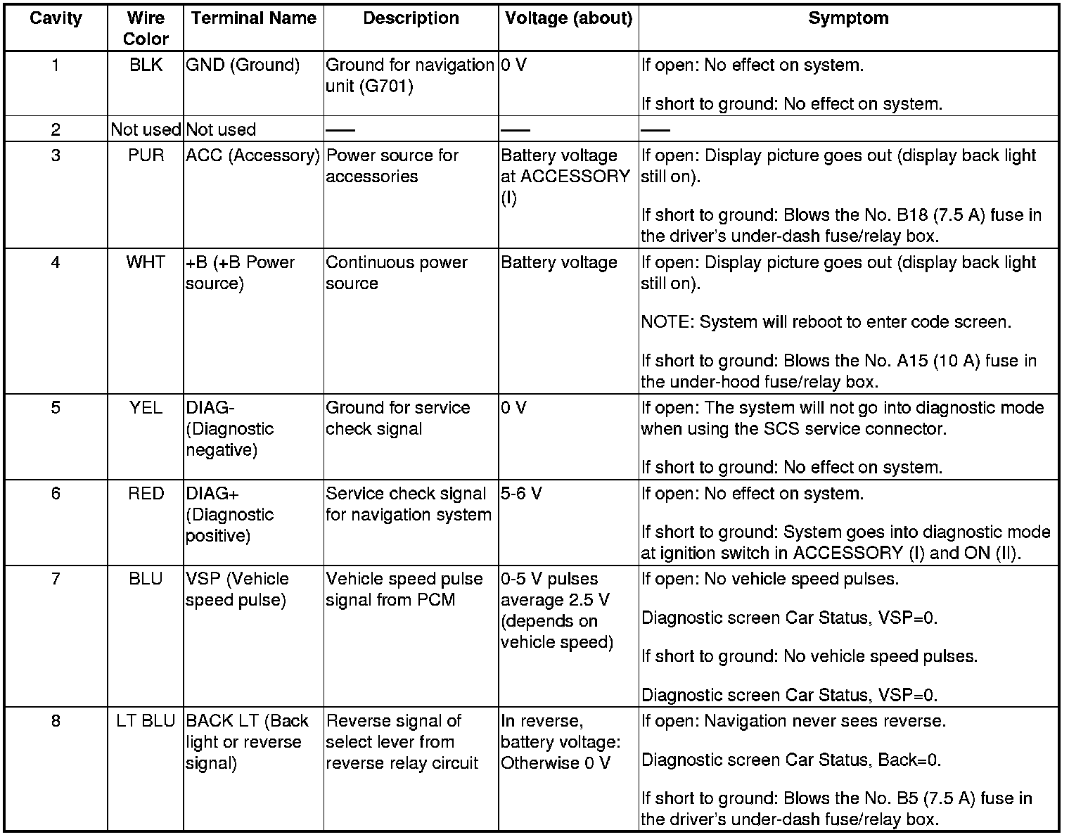 Navigation Unit Inputs and Outputs for Connector A (8P)