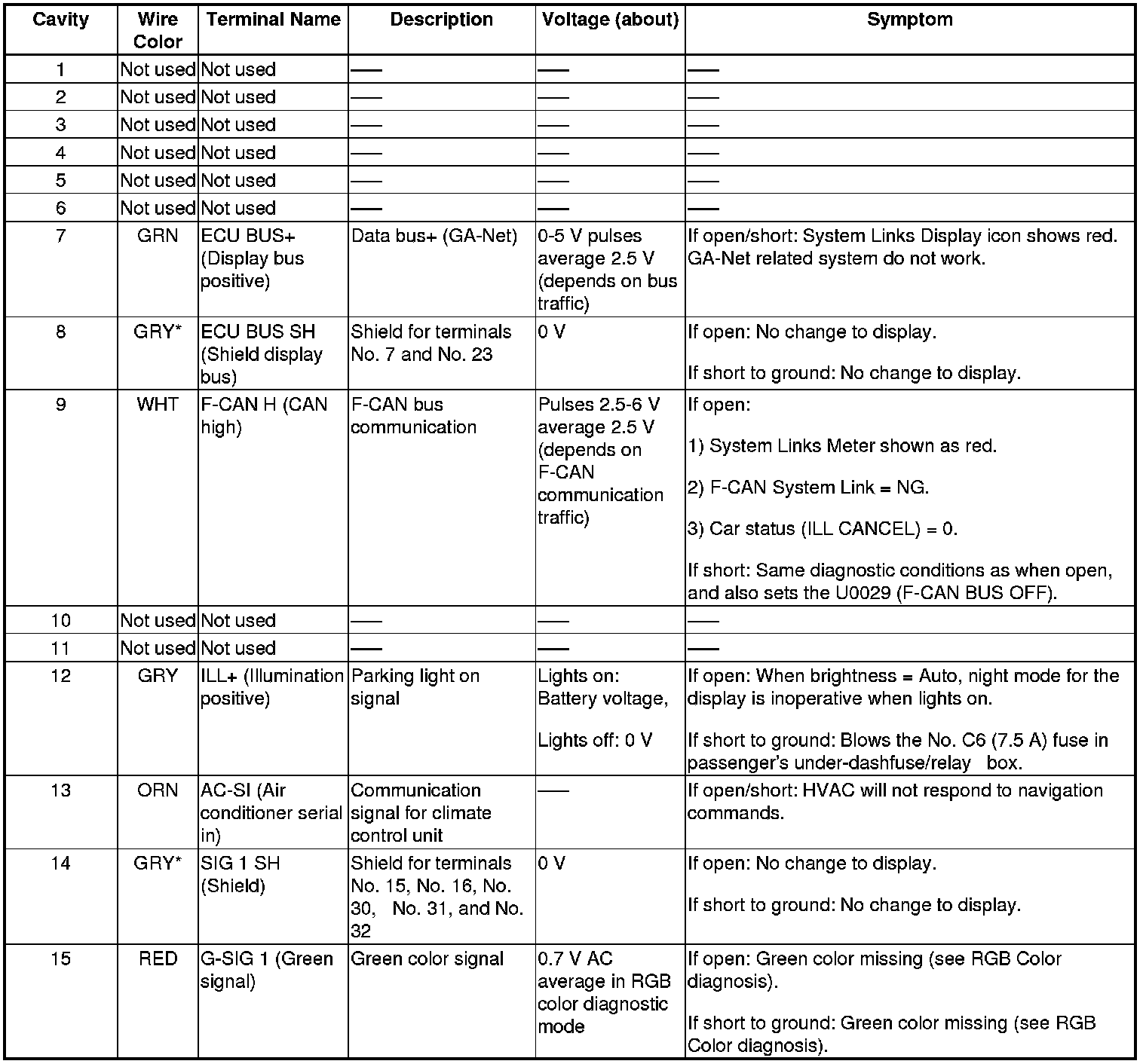 The GA-Net bus passes audio and navigation commands throughout the navigation and audio components. These commands include navigation audio/XM/USB selections by voice, XM station, XM/USB device music title names. Because the entire bus is interconnected between components, an open or short in the GA-Net bus harness may cause any or all of these functions to become inoperative.