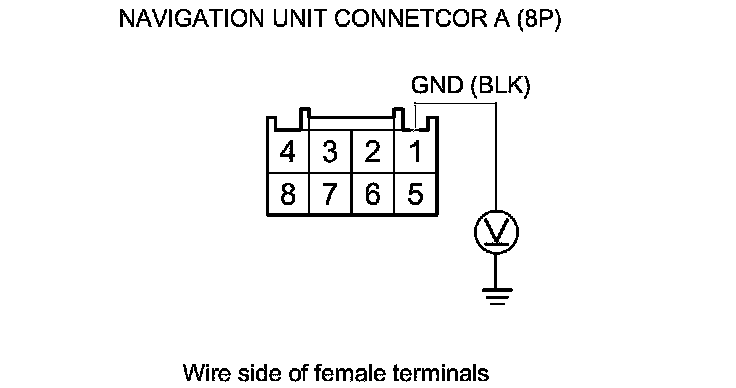 3. Measure the voltage between navigation unit connector A (8P) terminal No. 1 and body ground.