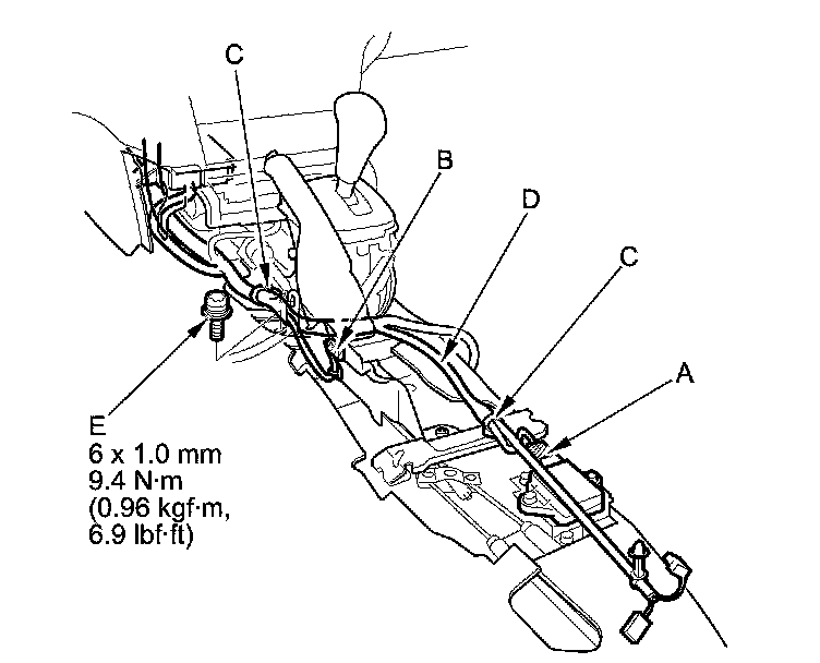 5. Disconnect the yaw rate-acceleration sensor connector (A) and the parking brake switch connector (B), and detach the harness clips (C) fastening the dashboard wire harness (D). Remove the TORX ground bolt (E) with a TORX T30 bit.