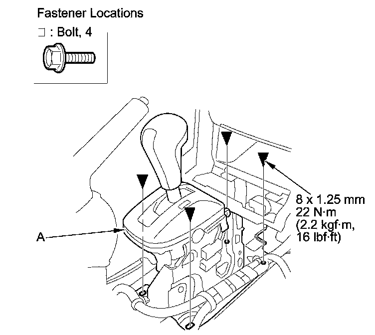 8. Remove the bolts, then remove the shift lever assembly (A).