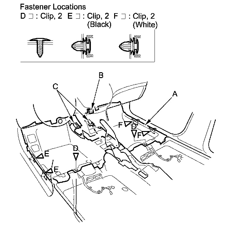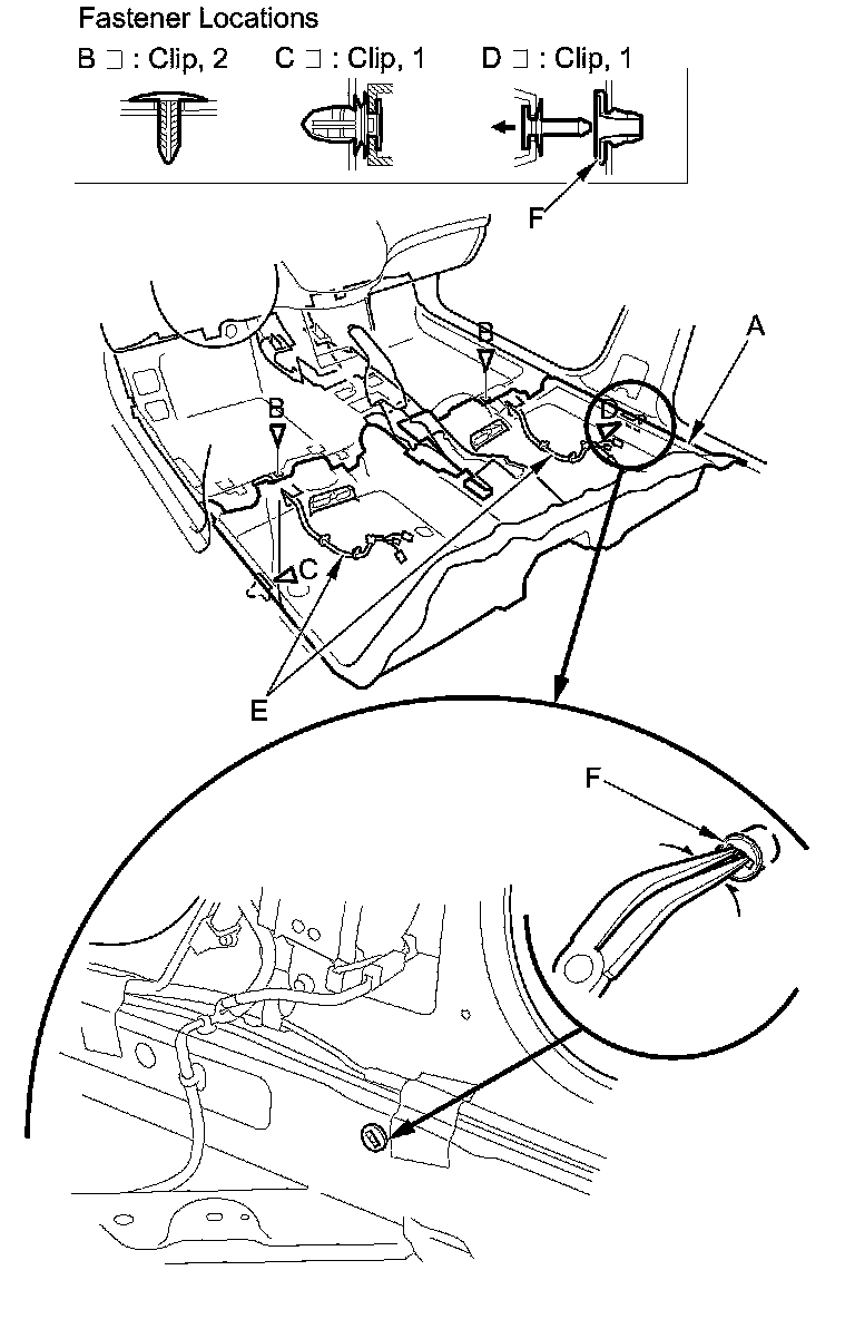 3. Detach the clips (D, E, F) fastening the carpet to both door sill areas.