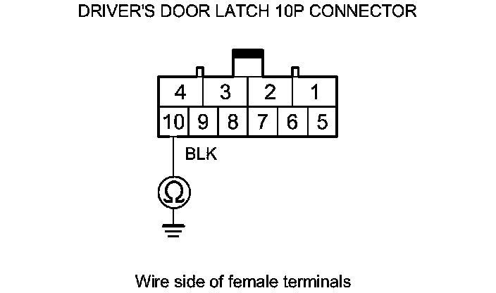 7. Check for continuity between driver's door latch 10P connector terminal No. 10 and body ground.