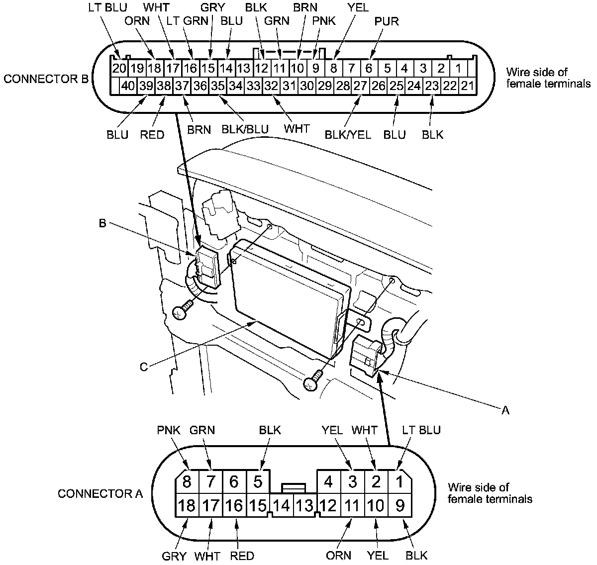 3. Disconnect the 18P connector (A) and 40P connector (B) from the power seat control unit (C).