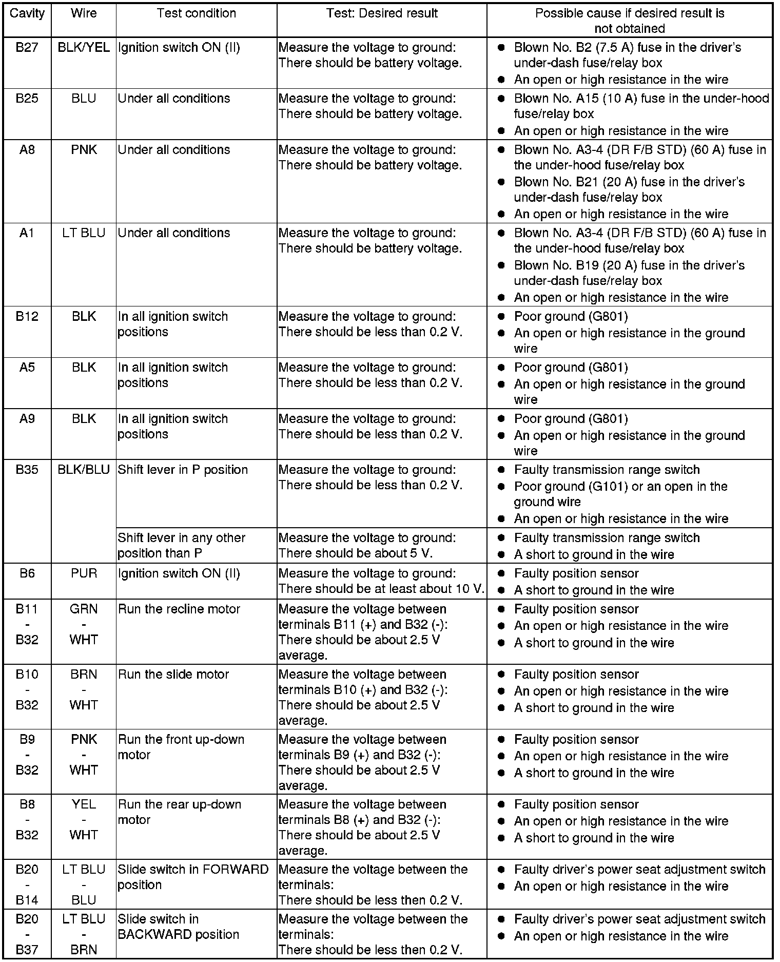 5. Reconnect the connectors to the power seat control unit, and do the following input tests: