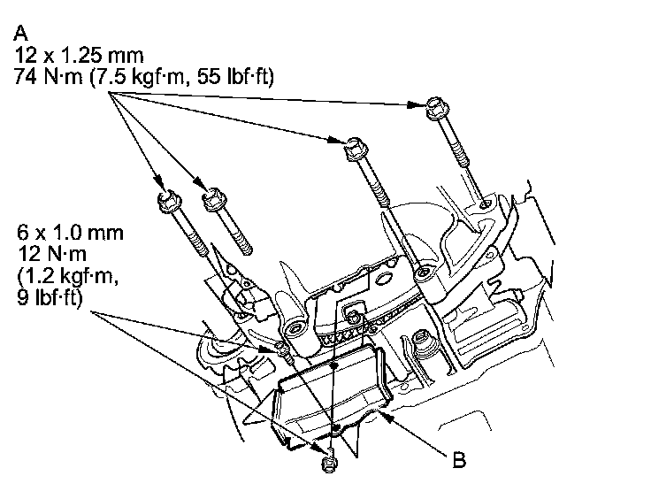 6. Tighten the four bolts (A) securing the transmission, then install the torque converter case cover (B).