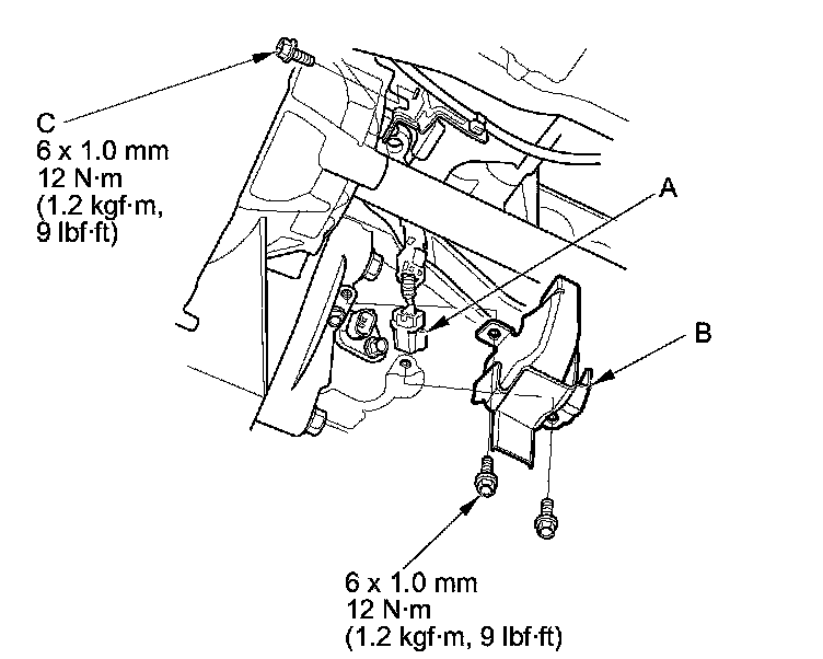 7. Connect the CKP sensor connector (A), then install the CKP sensor cover (B) and the bolt (C).