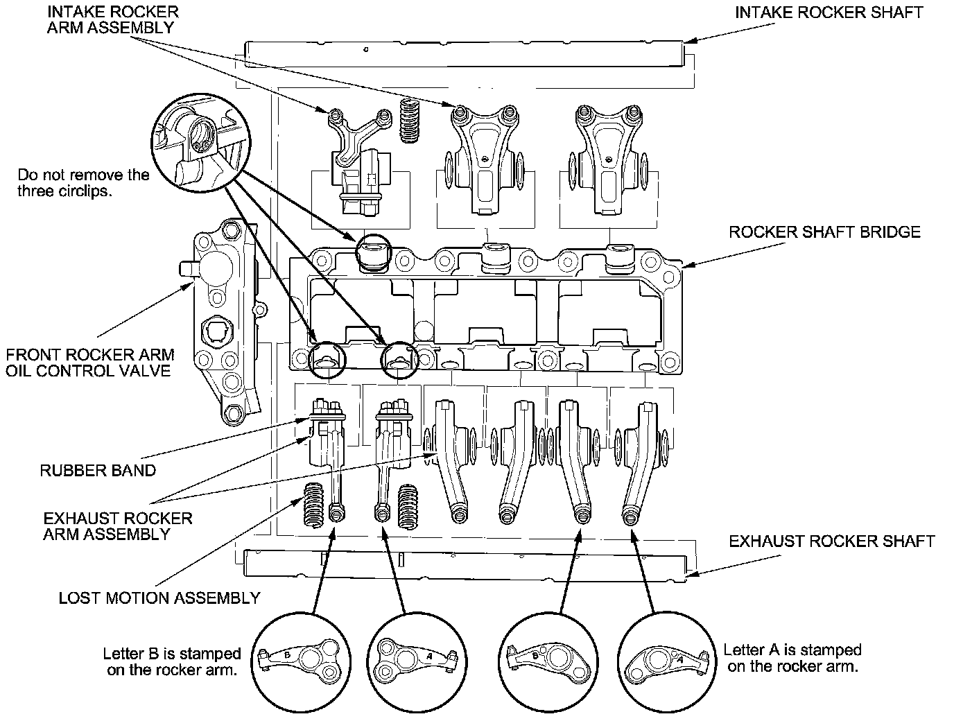 - Never remove any of the circlips that retain the lost motion assemblies in the rocker shaft bridge. The circlips are not available separately, and are factory installed in the rocker shaft bridge. To remove the lost motion assemblies, first remove the rocker shafts and the rocker arms.