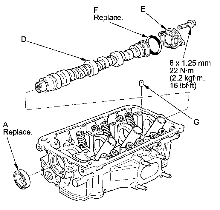 6. Insert the camshaft (D) into the cylinder head, then install the camshaft thrust cover (E). Always use a new O-ring (F). Apply new engine oil to the journals and the cam lobes.
