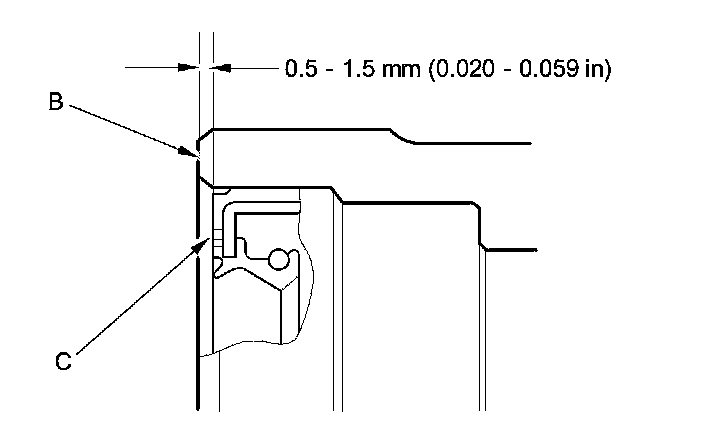 5. Measure the distance between the cylinder head surface (B) and the oil seal (C).