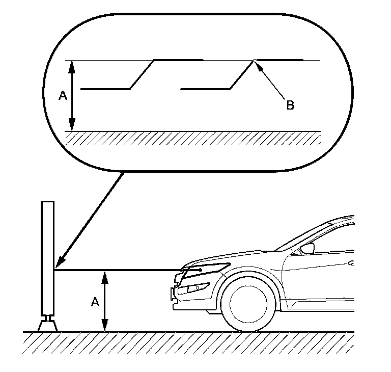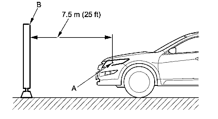 2. Park the vehicle so that the center mark of the headlight (A) is 7.5 m (25 ft) away from a wall or a screen (B).