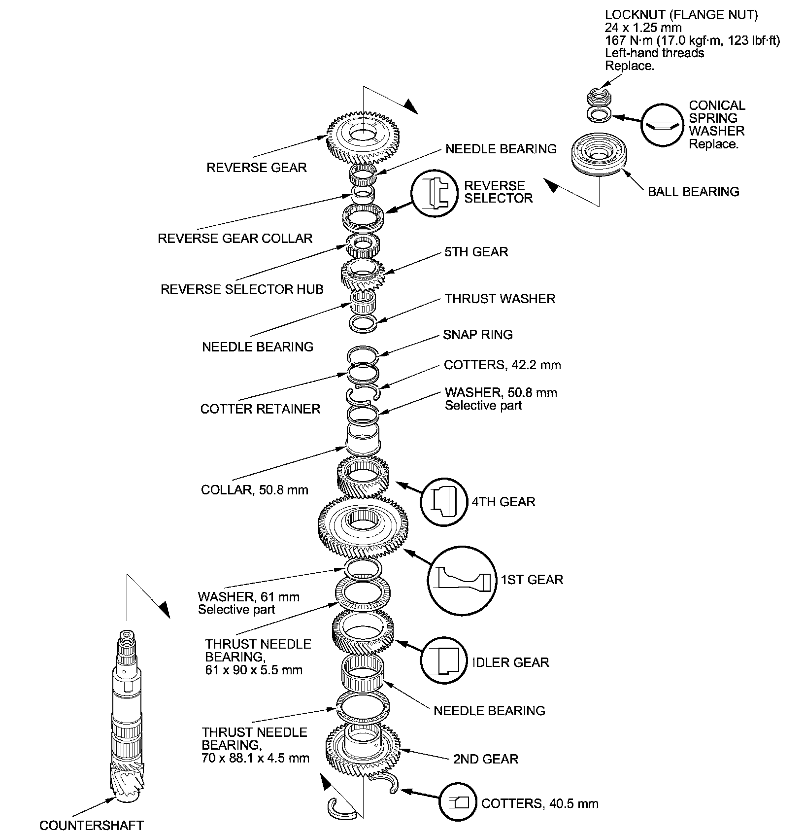 2. Hold the countershaft securely using a wrench clamped in a bench vise, loosen the locknut, and remove it. The locknut has left-hand threads.