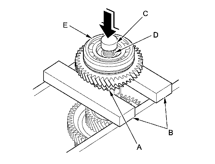 3. Place the countershaft 5th gear (A) on press bases (B), and place a spacer (C) between the countershaft (D) and the press to prevent damaging the countershaft.