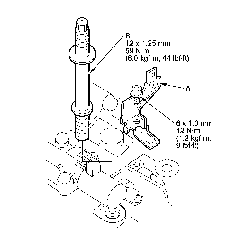 78. Install the harness clamp bracket (A), and install the harness clamp (B) on its bracket.