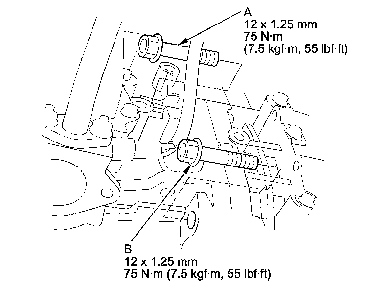 50. Position the upper transmission mount (A), and tighten new upper transmission mount bolts (B) to the body.