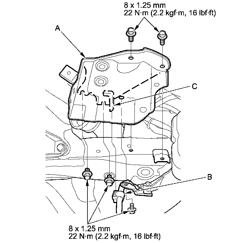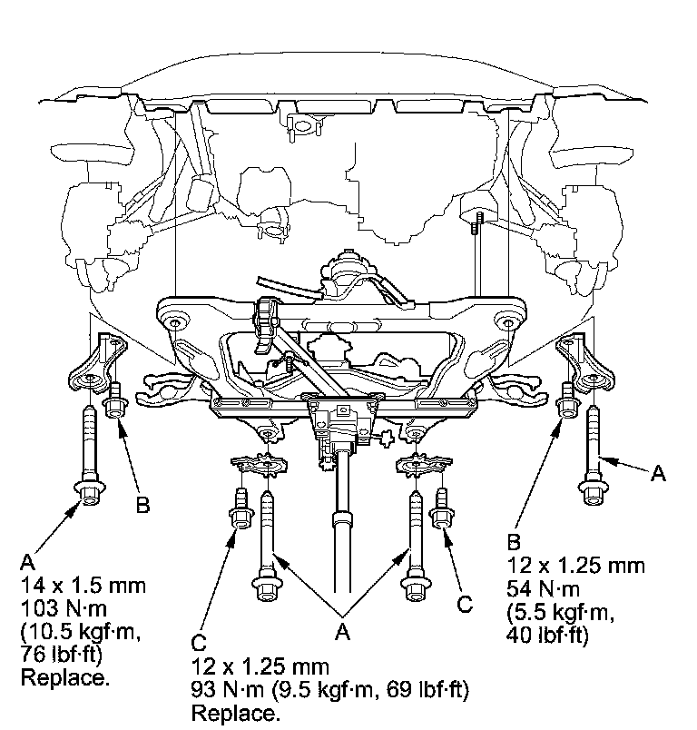28. Raise the front subframe up to the body, then loosely install new front subframe mounting bolts (A), the front stiffener mounting bolts (B), and new rear stiffener mounting bolts (C).