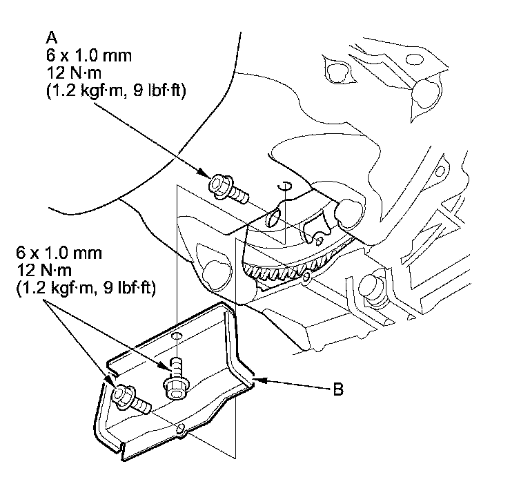 73. Install the harness cover (A) on its bracket (B), and secure it with the bolt.