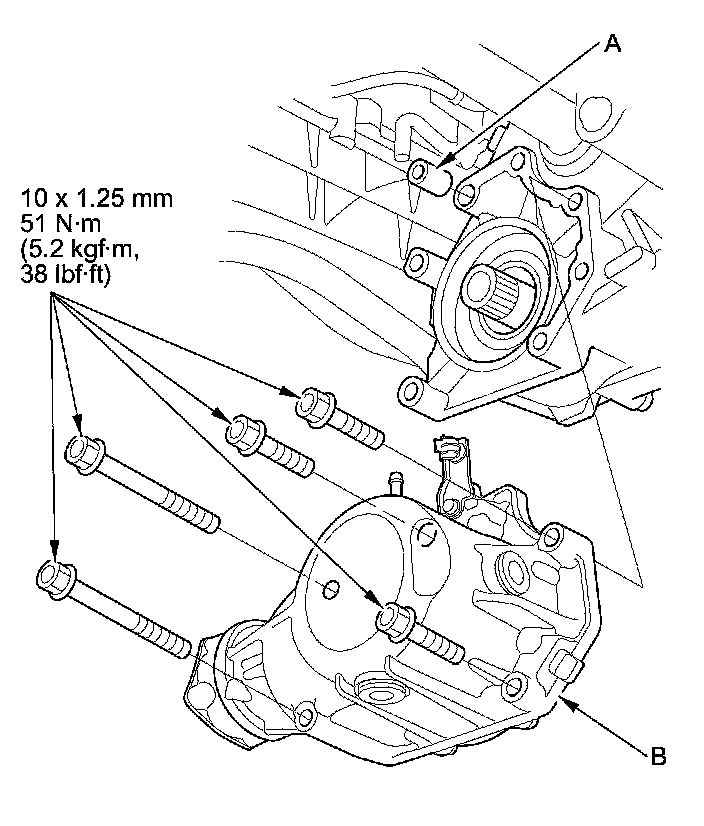 35. 4WD: Install the 14 x 20 mm dowel pin (A) in the transmission, and install the transfer assembly (B) on the transmission.