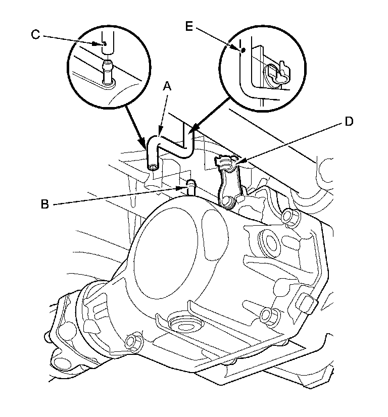 37. 4WD: Connect the transfer breather hose (A) over the breather pipe (B) with the dot mark (C) facing the rear of the vehicle, then install the hose on the clamp (D) at the dot mark (E).