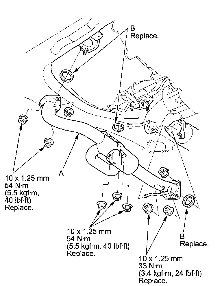 38. Install exhaust pipe A with new self-locking nuts and new gaskets (B).