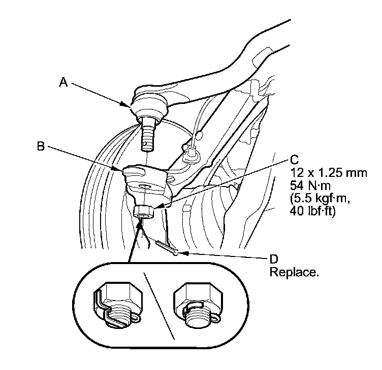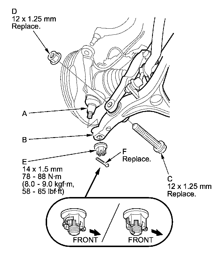 NOTE: Insert a new cotter pin (F) into the ball joint pin hole from the front to the rear of the vehicle, and bend its end as shown. Check the ball joint pin hole direction before connecting the ball joint.