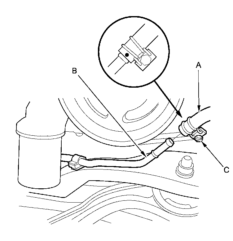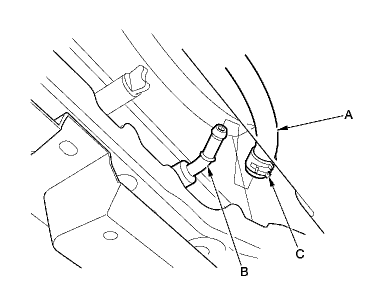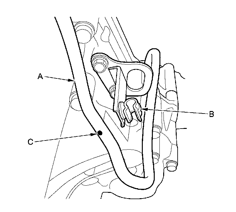 46. Connect the power steering fluid hose (A) to the power steering fluid line (B), and secure the hose with its clamp (C) as shown.